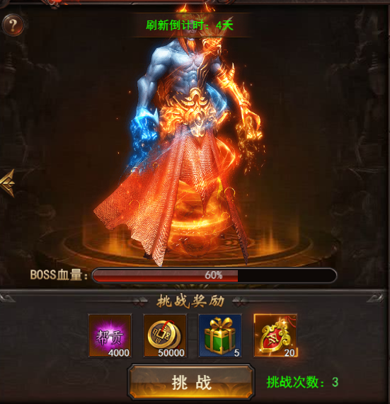 4.玩家每天有3次机会挑战B0SS,第二天00:00重置次数。