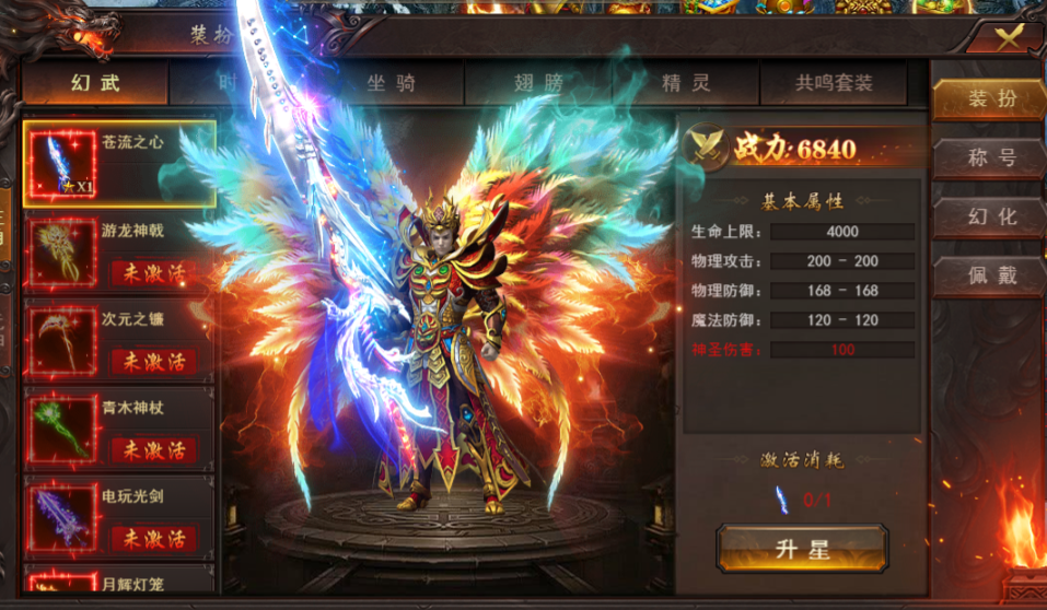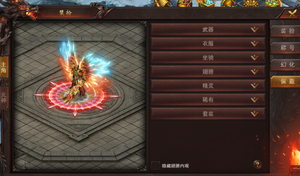 装扮分别有:幻武,时装,坐骑,翅膀,精灵
