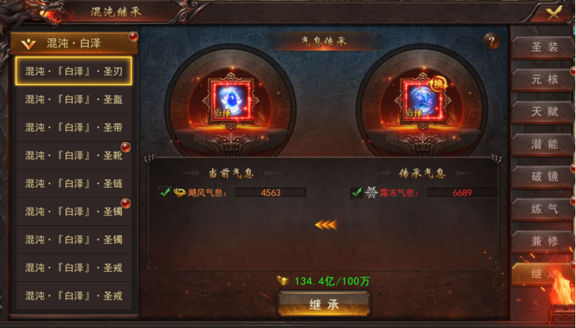 3.白泽圣装最大1条气息属性,肥遗最大2条气息属性,獓狠最大3条气息属性,麒麟最大4条气息属性。对应圣装上气息属性可以通过继承功能转移到同阶的另一件装备上,进行过转移的装备无法再次进行转移,转移后的装备上没有气息属性也是可以进行元核培育,每套圣装都对应一个元核,培育获取元核升级经验和对应元核结晶,气息置换只可以置换本职业对应的两个气息值兑换