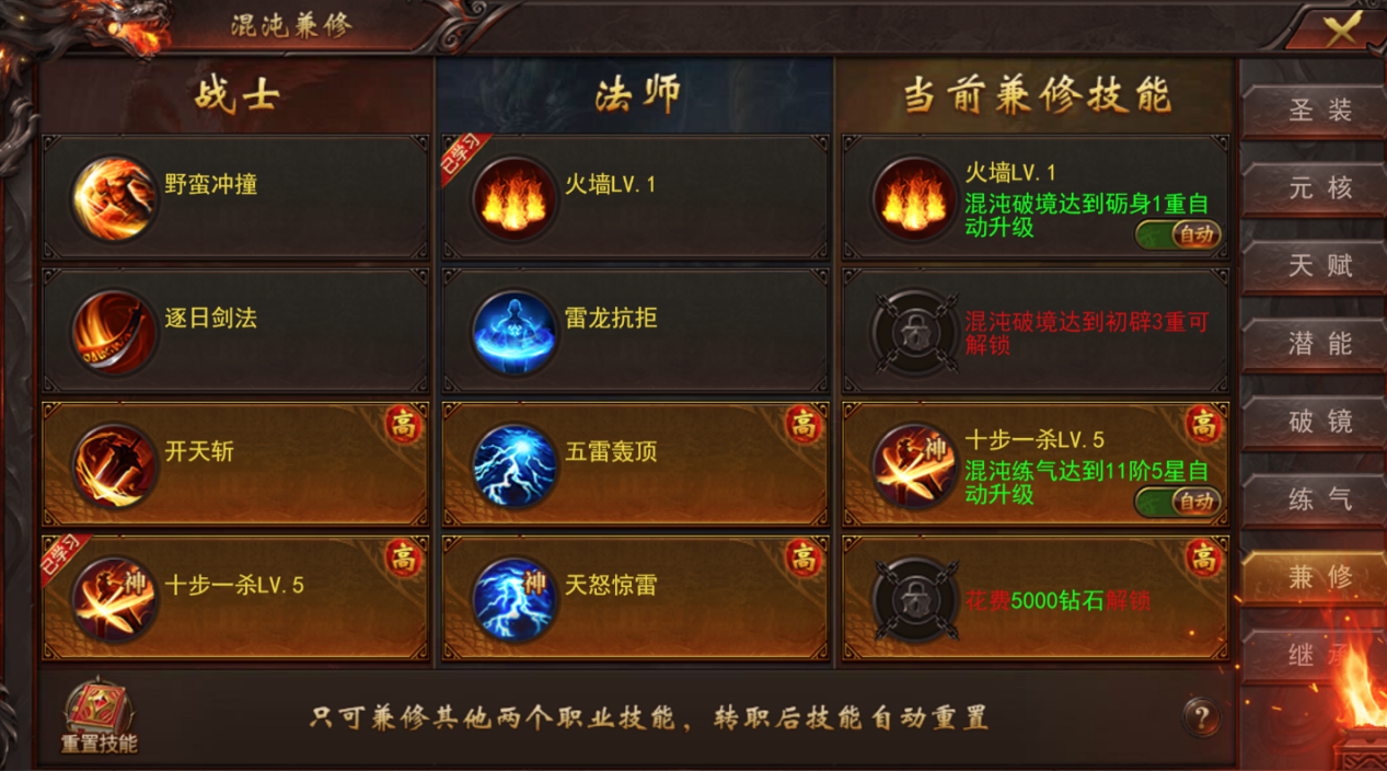 可以兼修其他职业4个技能,其中高级和初级各两个,达到对应条件可消耗道具解锁兼修技能槽位,达到技能升级条件时兼修的技能会自动升级,转职后兼修会自动重置