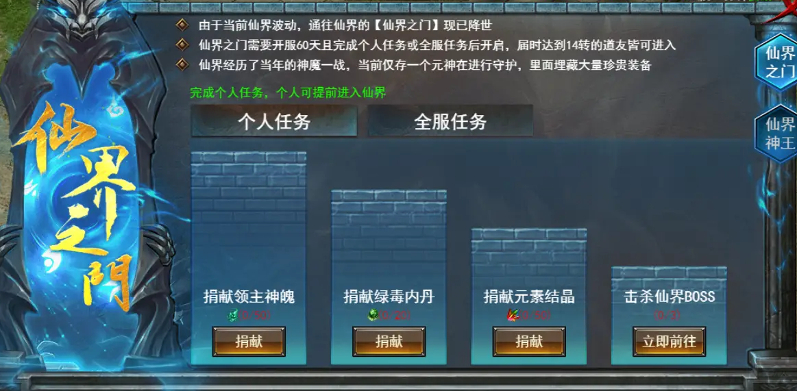 完成任务我们就可以进入仙界了,或者等全服任务完成也可以直接进入