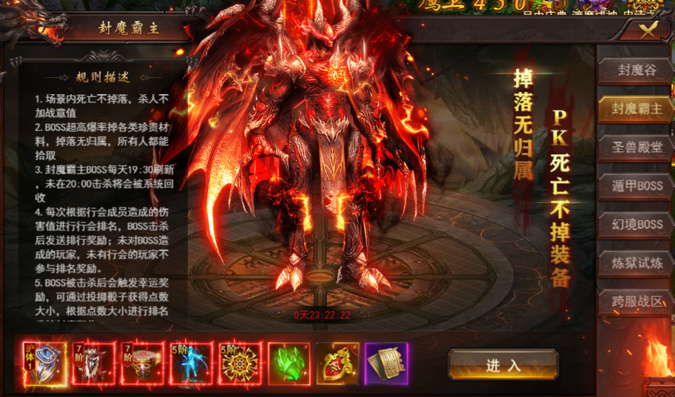 在封魔霸主活动内死亡不会掉落装备,杀人也不会增加战意值