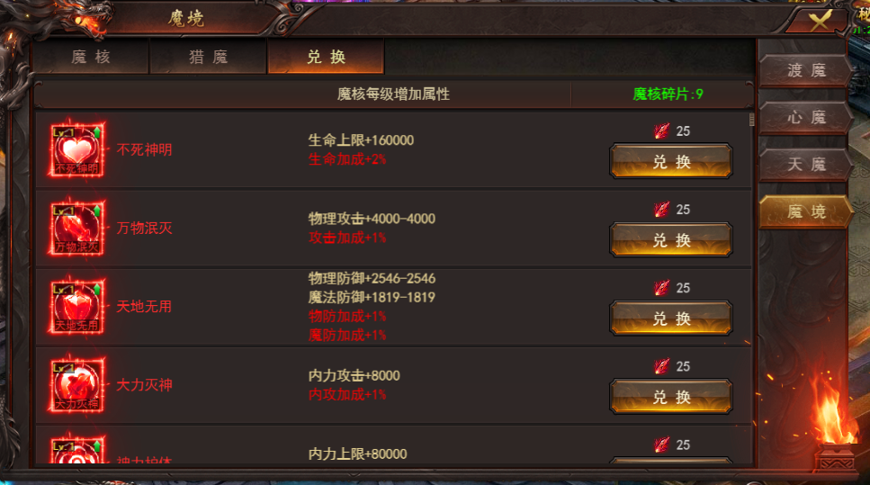 当玩家在猎魔过程中获得了魔核碎片后,就可以在兑换页面用这些碎片兑换红色的极品魔核