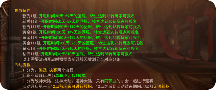 每期活动开启前,满足小组开服时间和转生要求的玩家才有资格报名参与对应小组的巅峰赛。具体条件如下: