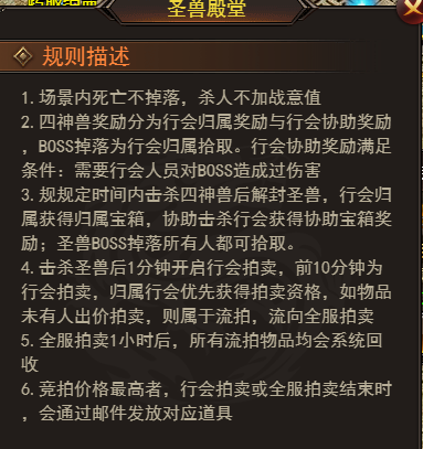 3.拍卖奖励:击杀圣兽后1分钟开启行会拍卖,前10分钟行会优先竞拍,流拍物品会流向全服拍卖,全服拍卖1小时后未拍出的物品会被系统回收,竞拍成功后道具会通过邮件发放!