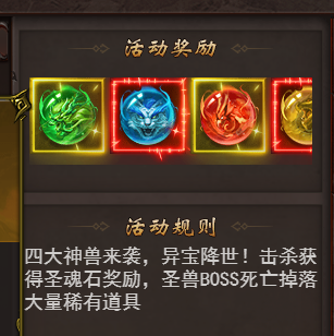 1.BOSS掉落:击杀四神兽和圣兽后,会掉落圣魂石、圣魂装备、觉醒石、金币等珍贵道具,圣魂石还能合成圣魂装备,50阶以上装备吞噬圣魂装备还能获得强力属性加成!