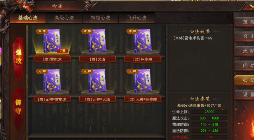 心法分为四个等级:基础、高级、神级和飞升。不同等级的心法拥有各自独特的特点和加成效果。例如,强攻型心法能提升技能伤害系数,而防御型心法则降低受到的伤害。