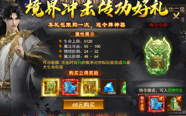 其中第二层弟子传功修炼室进入所需要的传功令牌,可以点击剑神传功的页面内左上角,购买传功礼包即可获得。